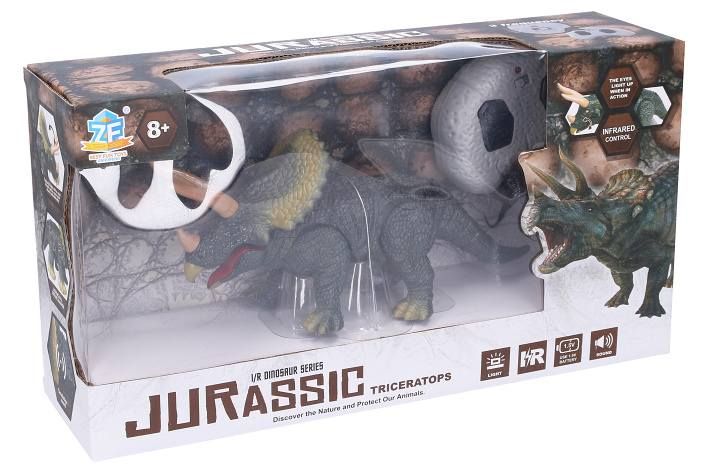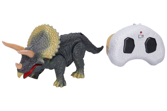 Dino Triceratops RC na dálkové ovládání. Velikost 24 x 11 x 8 cm. IR ovladač. Svítící oči a otevírací tlama. Pohyb dopředu a dozadu. Výběr 3 frekvencí (A, B, C).