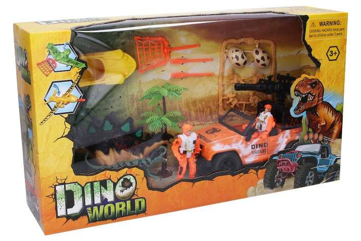Dinosauří set s figurkami. Velikost auta 22 cm, figurek 10 cm. Součástí 2 figurky, 2 dinosauři, terénní auto, člun, dinosauří vejce, malí dinosauři a další.