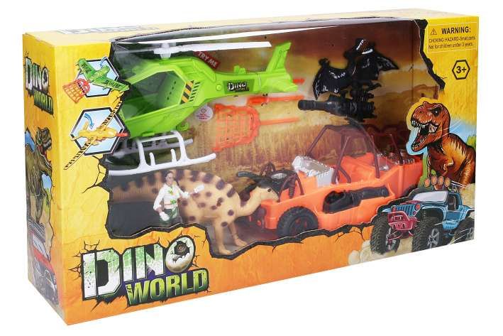 Dinosauří set s figurkou a efekty. Velikost vozidla 24 cm, figurky 10 cm, dinosaura 22 cm. Světelné a zvukové efekty vrtulníku. 3xAG10 do vrtulníku součástí. Součástí figurka, 2 dinosauři, vozidlo, vrtulník a další.