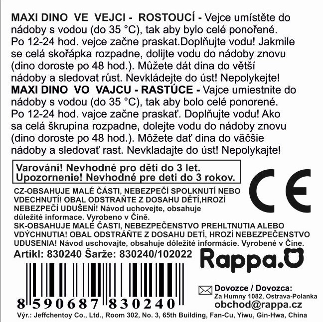 Chceš, aby se ti doma vylíhnul malý dinosaurus? Vlož vejce do nádoby, nádobu naplň vodou tak, aby bylo vejce celé pod vodou. Po 12 - 24 hodinách začne vejce praskat. Pokud klesne hladina vody, vodu dolij. Po 48 hodinách je dinosaurus vylíhnutý. Senzace!