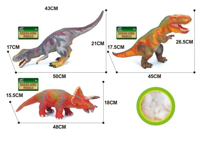 Dinosaurus má na spodní straně tlačítko a po zmáčknutí vydává zvuky. 3 druhy: Triceratops, 2 designy T-Rex. Na baterie: 3x LR44 (jsou součástí balení)