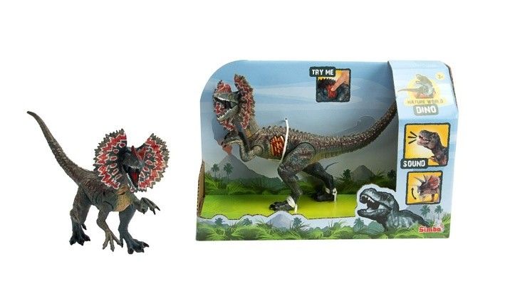 Dinosaurus vydávající zvuky, 3 druhy - T-Rex, Triceratops, Dilophosaurus. Figurky jsou pohyblivé, délka 23 cm.