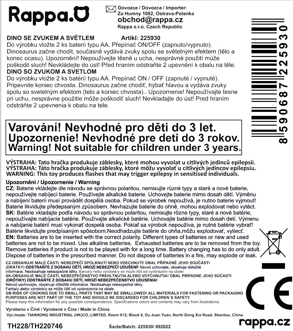Jako v pravěku si budeš připadat s tímto senzačním dinosaurem! Po zapnutí začne chodit, vydávat zvuk a svítí. Dinosaurus vyžaduje vložení 2 ks baterií typu AA, které nejsou součástí balení. Hračka je vyrobena z PVC.