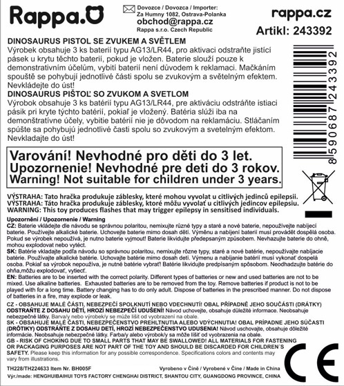 Náš dinosaurus T-Rex pistol se zvukovými efekty je ideální hračka pro každého malého fanouška pravěku. Mačkáním spouště se aktivují realistické pohyby, děsivý řev a světelný efekt. Výrobek obsahuje 3 ks baterií typu AG13/LR44.