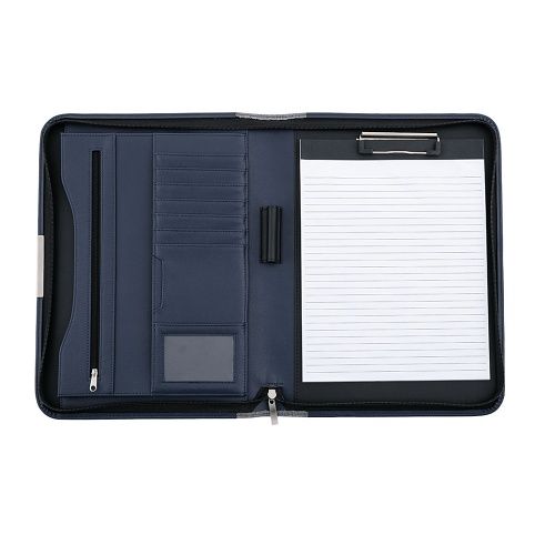 Konferenční desky uzavíratelné na zip, blok linkovaný A4 s klipem, přihrádky na dokumenty a vizitky, poutko na tužku. Hřbet 30mm. Materiál PU/textil šedo-modrá.