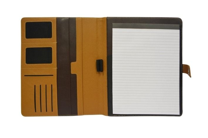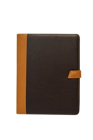 Konferenční desky s uzavíráním na poutko s drukem, blok linkovaný A4, přihrádky na dokumenty a vizitky, 2xpoutko na tužku. Hřbet 10mm. Materiál PU tmavá/světlá hnědá barva.