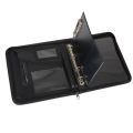 Uzavíratelná na zip, uvnitř kapsy na dokumenty a vizitky, úchytka na psací potřeby, jednodeska, 4kroužková mechanika D20
