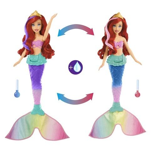 Plavající malá mořská víla Ariel má ocasní ploutev z měkkého materiálu v krásných barvách a po zmáčknutí boků panenky se celý ocas začne pohybovat jako při plavání! Vlasy a ocas panenky také mění barvu díky vodě a součástí balení jsou 4 doplňky pro ještě