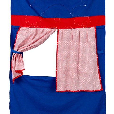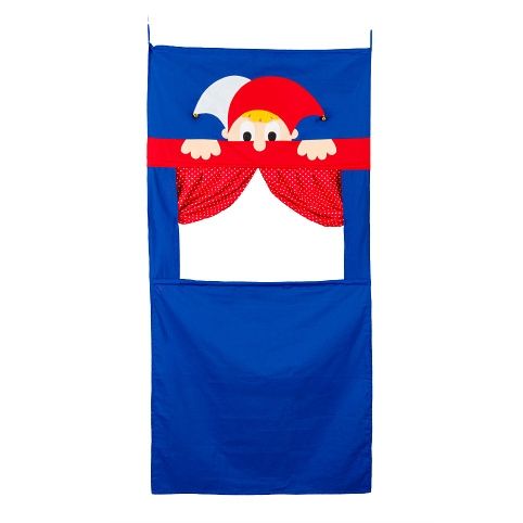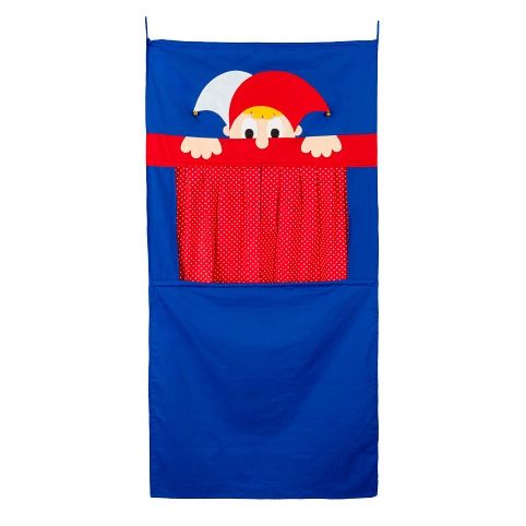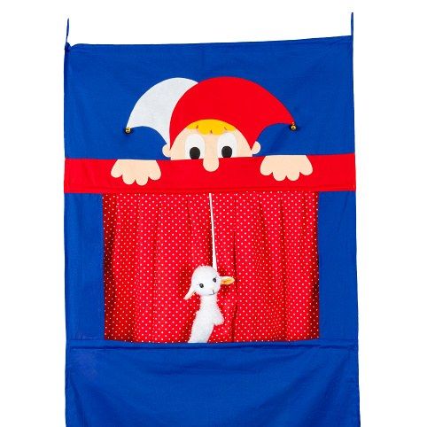 Závěsné textilní divadlo s oponou a dvěmi opravdovými rolničkami vyztužené dřevěnými tyčkami. Určeno k zavěšení na dveřní zárubeň, ideálně pomocí rozpěrné tyče (obj.kód 92051A).