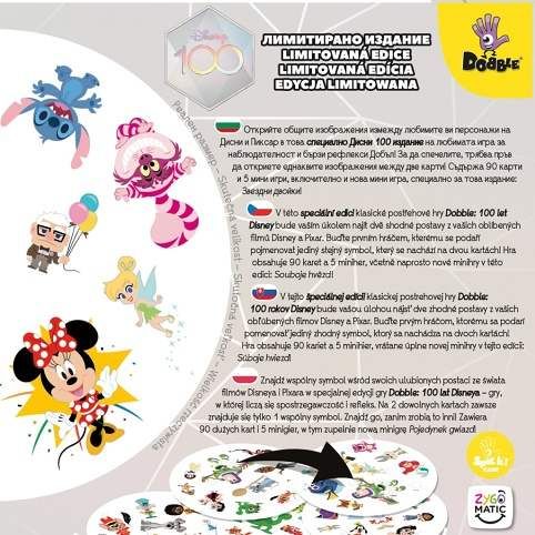 Oslavte s Dobble 100. výročí Disney! V této speciální edici klasické postřehové hry Dobble: 100 let Disney bude vaším úkolem najít dvě shodné postavy z vašich oblíbených filmů Disney a Pixar. Speciální jsou i karty, které jsou oproti klasickému Dobblu výrazně větší. Buďte prvním hráčem, kterému se podaří pojmenovat jediný symbol, který se nachází na obou kartách! Hra zahrnuje 90 karet a 5 miniher, včetně naprosto nové minihry v této edici: Souboje hvězd! Na každé z 90 kartiček se nachází 10 symbolů. Celkem je ve hře 91 jedinečných symbolů. Na dvou libovolných kartách je vždy pouze jeden symbol stejný. Buďte připraveni, abyste ho našli jako první! Oproti zvyklostem není tento Dobble balen v plechové krabičce. Obsah balení: 90 karet Česká, slovenská, polská a bulharská pravidla.