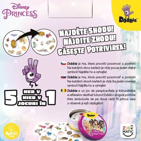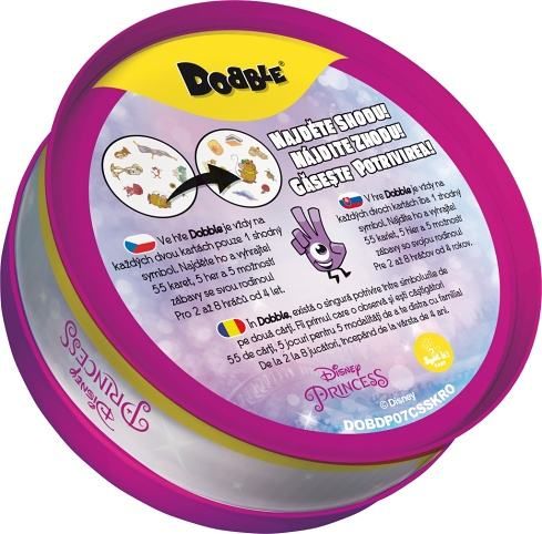 Oblíbená postřehová hra Dobble na motivy Disney princezen, postaviček a charakterů. Rychlost, postřeh, reflexy! Dobble Disney princezny, to je 57 různých symbolů, 55 karet, 8 obrázků na kartě a každé dvě karty spolu mají společný jen jeden obrázek! Hra je kompletně v češtině i slovenštině a nabízí zcela unikátní zábavu. Děti zde hledají dva stejné obrázky na kartách při různých verzích hry (v pravidlech je popsáno celkem 5 her). Super jsou kulaté karty i jednoduchá pravidla vysvětlená doslova za pár sekund. Hra je určená především pro děti, ale i jejich rodiče – zkrátka pro všechny, kteří se chtějí pořádně bavit a nemají čas pročítat dlouhá pravidla. Plechová krabička zaručuje bezpečí karet a jednoduše umožňuje mít hru vždy u sebe. Vyzkoušejte i Vy postřehový fenomén Dobble a jistě budete překvapeni, jak i tak jednoduchá hra může být zábavná! V pravidlech naleznete popsaných všech 57 různých symbolů. Obsah balení: 55 karet v plechové krabičce 1 česká, slovenská a rumunská pravidla