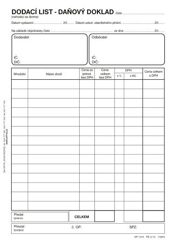 Dodací list - daňový doklad, samopropisující, nečíslovaný tiskopis, ve formátu A5 na výšku. Tento tiskopis obsahuje 50 listů v bloku bez perforace.