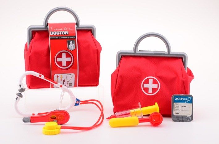 Doktorská sada obsahuje plastový stetoskop, kladívko, injekci, jmenovku a teploměr. Rozměry tašky cca 19 x 22 x 18 cm. Věk 3+