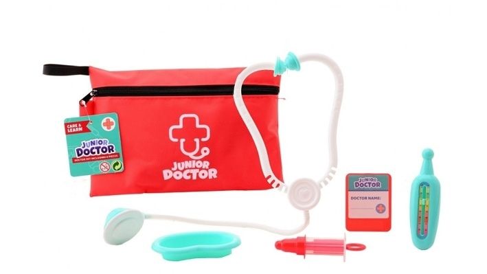 Praktická doktorská sada v taštičce. Sada obsahuje teploměr, stetoskop, stříkačku a další.