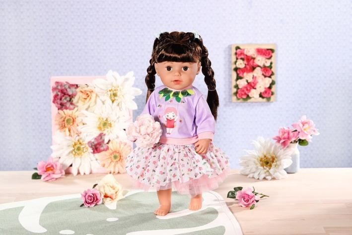 Oblečení Dolly Moda se vesele houpe v šatní skříni. Díky univerzálnímu střihu si oblečení můžou půjčovat různé panenky velikosti 39–46 cm. Skvěle padnou panenkám BABY born, Baby Annabell i jiným. Vyšívané a našité lístky u krčního lemu trička vypadají jako koruna stromu. Z ní visí houpačka, na které se zasněně houpe rozkošná holčička. Růžové žebrované lemy krásně kontrastují s fialovým tričkem. Nadýchaná vrstvená sukýnka je ozdobena spoustou drobných kvítků a vesele vlaje ve větru. • Originální Dolly Moda od Zapf Creation pro panenky BABY born, Baby Annabell a jiné. • Pro panenky velikosti 39–46 cm. • Rozšiřuje možnosti hry, podněcuje fantazii a povzbuzuje děti ke hře na malé rodiče. Dolly Moda Oblečení s houpačkou pro panenky velikosti 39–46 cm. Součástí je tričko a sukýnka.