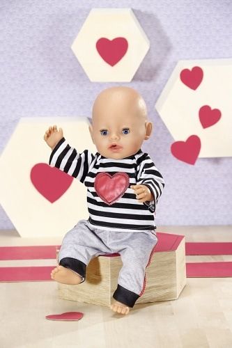 Srdce těch, kdo milují módu, patří oblečení Dolly Moda. Díky univerzálnímu střihu si oblečení Dolly Moda můžou půjčovat různé panenky velikosti 39–46 cm. Skvěle padne panenkám BABY born, Baby Annabell i jiným. Velké červené srdce ohraničené černými stehy září z klasického černobílého proužkovaného trička s dlouhými rukávy. Decentní šedé tepláky mají ve spodní části tmavé manžety a postranní červené pruhy s roztomilým prošíváním – to je ale hezký kontrast. • Originální Dolly Moda od Zapf Creation pro panenky BABY born, Baby Annabell a jiné. • Pro panenky velikosti 39–46 cm. • Rozšiřuje možnosti hry, podněcuje fantazii a povzbuzuje děti ke hře na malé rodiče. Dolly Moda Proužkované sportovní oblečení, 43 cm. Součástí je mikina a kalhoty.