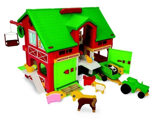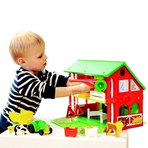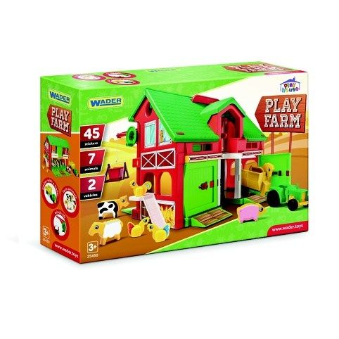 Farmářský set Wader 25450 Barevná farma pro opravdové farmáře. Na farmě je opravdu živo, malí farmáři mohou chovat : slepice, koníka, ovečku, prasátko a kravičku. Na farmě jsou i stroje pro práci na poli pro opravdové farmáře. Součástí balení je i traktor s valníkem. Na farmě můžete pomocí výtahu uklízet balíky sena, slepičky mají vlez do kurníku po žebříku, koník a kravička svoji stáj, prasátko svůj chlívek. Farma se dá celá uzavřít a přenášet nebo vzít s sebou na cesty.