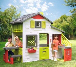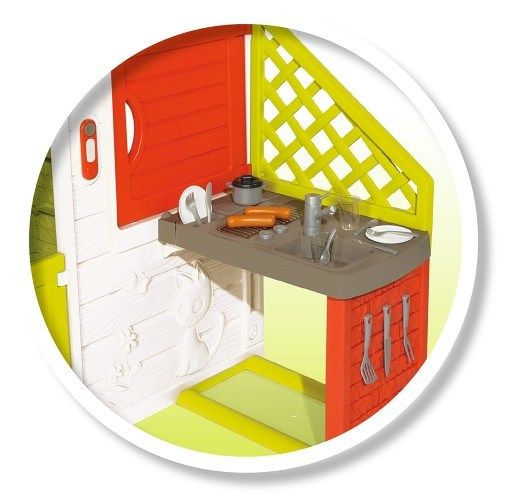 Prostorný domeček s funkčním zvonkem má 2x vrátka, 6 oken, odnímatelný piknikový stů s lavicemi a letní kuchyň s příslušenstvím. Lze rozšířit o další herní prvky. Ochrana proti UV záření. Rozměry: 217 x 172 x 155 cm.