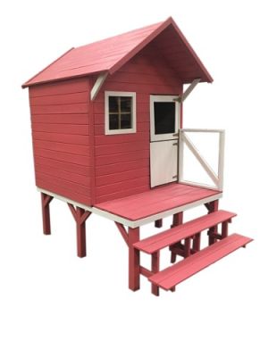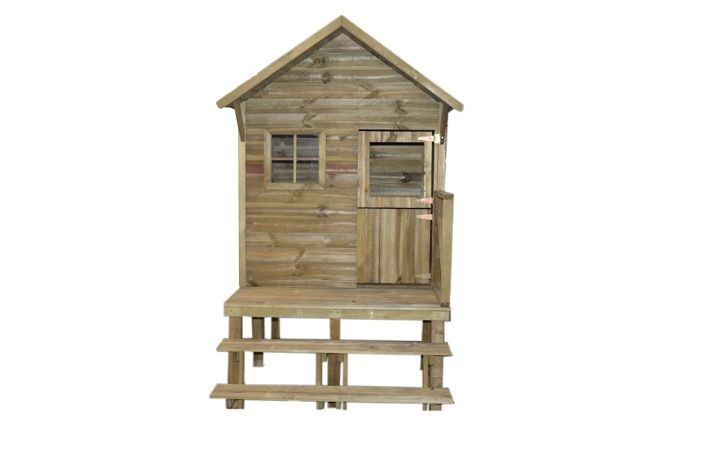 Dřevěný domek s podlahou na pilotech z borovicového dřeva se schůdky. Výška pilotů 60 cm. Základní rozměry 194×126 a vysoký 217 cm, balení obsahuje 4 stěny a střechu ve 2 panelech,menší vchodové dveře, podlážku.Dřevo ošetřeno proti plísním i dřevo napadajícímu hmyzu,broukům, domeček zaujímá prostor o velikosti 1,35m2. Dřevěná předložka 126×52 cm nad schody. Doporučeno pro děti od 3 let.