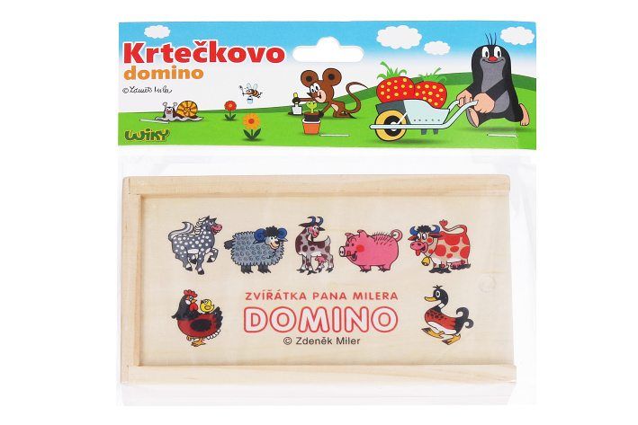 Domino dřevěné Krtek. S motivy zvířátek pana Milera. Rozměry dřevěné krabičky 16x9,2x4,5 cm. Návod součástí.
