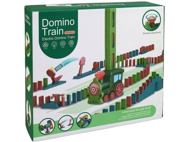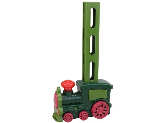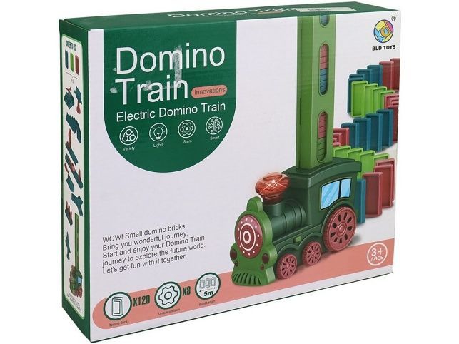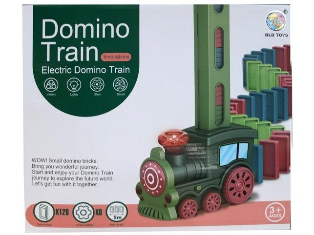 Lokomotiva s dominem, na baterie, 30 x 8 x 26 cm. Zábavná hra je určena pro všechny co milují domino efekt. Při tvoření se bude určitě hodit i fantazie a trošku té trpělivosti. O důležitou část skládání se postará lokomotiva, která jede a za zvuku hudby sama skládá kostičky cca 5 mm od sebe. Takto naskládané kostičky s tímto rozmezím následně zajistí krásný domino efekt. Směr jízdy lokomotivy můžete snadno změnit otočením vrchní části komínu. Balení obsahuje 120 ks kostiček ve třech barvách a ještě dalších 8 ks dolpňků jako je závora, stromek, mostík. Rozměr balení: 30 x 8 x 26 cm. Napájení lokomotivy: 2 x 1,5 V AA baterie. Materiál: plastDoporučený věk: 3+