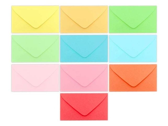 Barevné dopisní obálky C6 BALENÍ OBSAHUJE: - 100 ks barevných obálek (10 barev po 10 ks - červená, 2x modrá, oranžová, béžová, 2x zelená, žlutá, 2x růžová) Uvedená cena je za 1 ks. Všech 100 ks je balených ve fólii.
