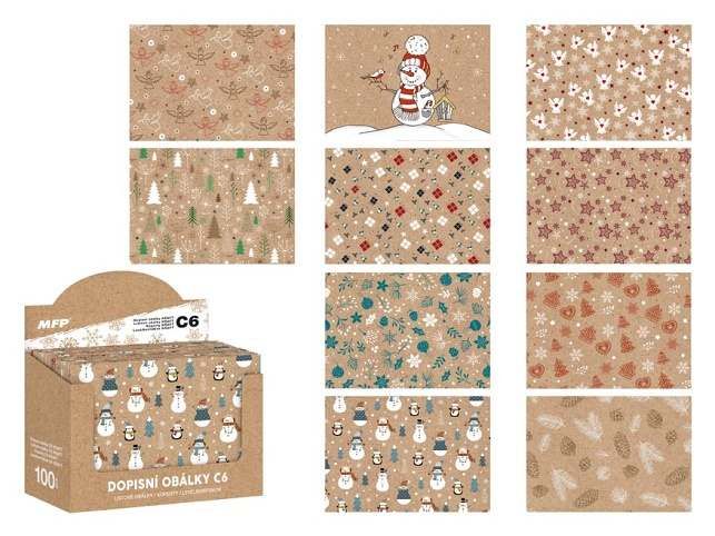 Celoplošně potištěné, vánoční, dopisní obálky C6 (KRAFT). Posíláte rádi dopisy? Pořiďte si u nás tyto krásné dopisní obálky a nezapomeňte si u nás také koupit dopisní papír a propisku! OBSAH BALENÍ: - 100 ks obálek (10 motivů) Všech 100 ks Uvedená cena je za 1 ks.