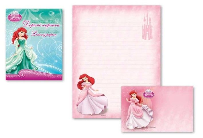 Dětská dopisní souprava pro dívky Ariel od Walt Disney. Obsahuje 10 potištěných dopisních papírů formátu A4 a 5 potištěných poštovních obálek C6. Na dopisním papíře i na obálce najdete obrázek Ariel. Dopisní papír je opatřený linkami. Baleno v nádherné papírové krabičce s motivem mořské panny Ariel. K dokonalosti je vše zabaleno v plastovém sáčku se závěsem. Formát: A4