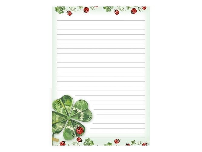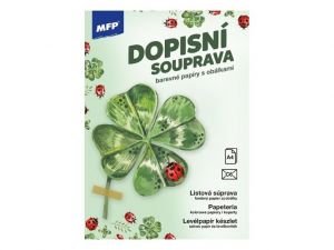 Dopisní souprava s obrázkem ČTYŘLÍSTEK - Píšete rádi dopisy svým známým? Pořiďte si u nás krásné dopisní papíry s různými motivy a nezapomeňte ani na psací potřeby. BALENÍ OBSAHUJE: - 10 potištěných dopisních papírů formátu A4 - 5 barevných poštovních obálek FORMÁT: A4 PROVEDENÍ: linkovaný Uvedená cena je za 1 balení. K dokonalosti je vše baleno v průhledném obalu se závěsem.