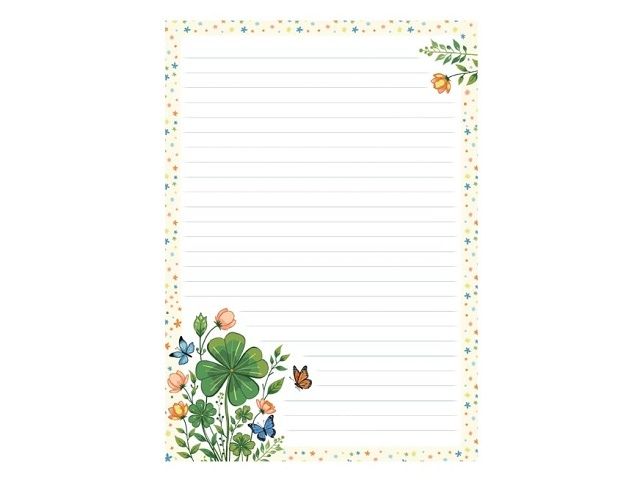Psaní pro štěstí! Dopisní sada s motivem čtyřlístků, květin a motýlů dodá vašemu psaní jemnost a svěžest. Vaše slova tak získají lehkost a kouzlo přírody, které potěší každého, kdo váš dopis otevře. BALENÍ OBSAHUJE: - 10 potištěných dopisních papírů formátu A4 - 5 barevných poštovních obálek formátu C6 FORMÁT: A4 MOTIV: čtyřlístek PROVEDENÍ: linkovaný Baleno v plastovém průhledném obalu se závěsem. Uvedená cena je za 1 balení.