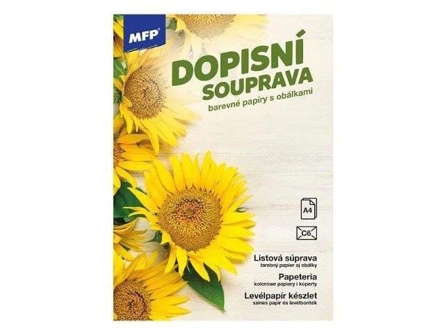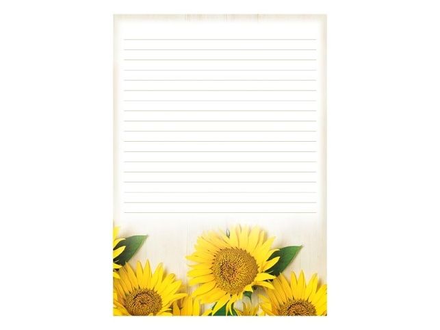 Dopisní souprava s obrázkem slunečnice. Píšete rádi dopisy svým známým? Pořiďte si u nás krásné dopisní papíry s různými motivy a nezapomeňte ani na psací potřeby. BALENÍ OBSAHUJE: - 10 potištěných dopisních papírů formátu A4 - 5 barevných poštovních obálek FORMÁT: A4 PROVEDENÍ: linkovaný Uvedená cena je za 1 balení. K dokonalosti je vše baleno v průhledném obalu se závěsem.