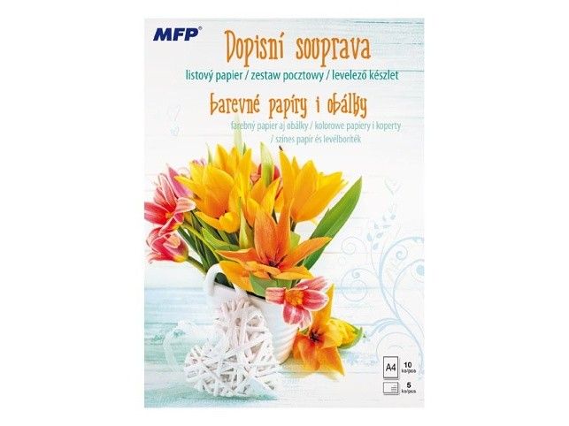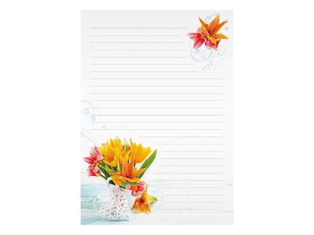 Dopisní souprava KVĚTY - Píšete rádi dopisy svým známým? Pořiďte si u nás krásné dopisní papíry s různými motivy a nezapomeňte ani na psací potřeby. BALENÍ OBSAHUJE: - 10 potištěných dopisních papírů formátu A4 - 5 barevných poštovních obálek FORMÁT: A4 PROVEDENÍ: linkovaný Uvedená cena je za 1 balení. K dokonalosti je vše baleno v průhledném obalu se závěsem.