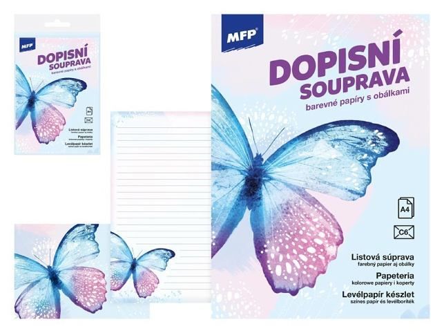 Dopisní souprava s obrázkem motýla. Píšete rádi dopisy svým známým? Pořiďte si u nás krásné dopisní papíry s různými motivy a nezapomeňte ani na psací potřeby. BALENÍ OBSAHUJE: - 10 potištěných dopisních papírů formátu A4 - 5 barevných poštovních obálek FORMÁT: A4 PROVEDENÍ: linkovaný Baleno v plastovém průhledném obalu se závěsem. Uvedená cena je za 1 balení.