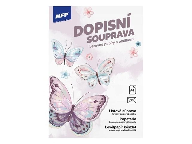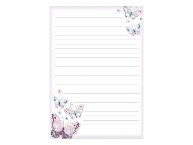 Dopisní souprava s obrázkem motýlů. Píšete rádi dopisy svým známým? Pořiďte si u nás krásné dopisní papíry s různými motivy a nezapomeňte ani na psací potřeby. BALENÍ OBSAHUJE: - 10 potištěných dopisních papírů formátu A4 - 5 barevných poštovních obálek FORMÁT: A4 PROVEDENÍ: linkovaný Uvedená cena je za 1 balení. K dokonalosti je vše baleno v průhledném obalu se závěsem.