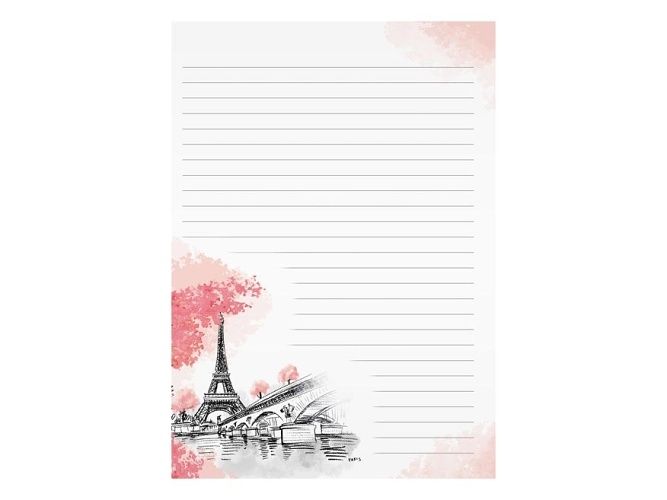 Dopisní souprava PAŘÍŽ - Píšete rádi dopisy svým známým? Pořiďte si u nás krásné dopisní papíry s různými motivy a nezapomeňte ani na psací potřeby. BALENÍ OBSAHUJE: - 10 potištěných dopisních papírů formátu A4 - 5 barevných poštovních obálek FORMÁT: A4 PROVEDENÍ: linkovaný Uvedená cena je za 1 balení. K dokonalosti je vše baleno v průhledném obalu se závěsem.