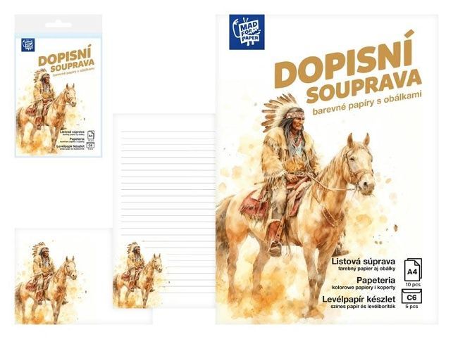 Psaní dopisů nemusí být nudná záležitost. Motiv indiána na koni dodává této dopisní soupravě dobrodružný charakter. Linkované listy formátu A4 vám pomohou udržet text hezky v řádcích a psaní tak zůstává přehledné. Obrázkový motiv je na papíru umístěn tak, aby dopis zpříjemnil, ale zároveň nechal dost prostoru pro vlastní slova. Součástí soupravy jsou také potištěné obálky formátu C6, které s dopisním papírem ladí a vytvářejí pěkně sjednocený vzhled celé korespondence. BALENÍ OBSAHUJE: - 10 potištěných dopisních papírů formátu A4 - 5 barevných poštovních obálek formátu C6 Formát: A4 Motiv: indián Provedení: linkovaný Baleno v plastovém průhledném obalu se závěsem. Uvedená cena je za 1 balení.