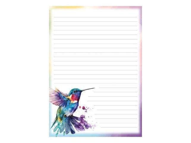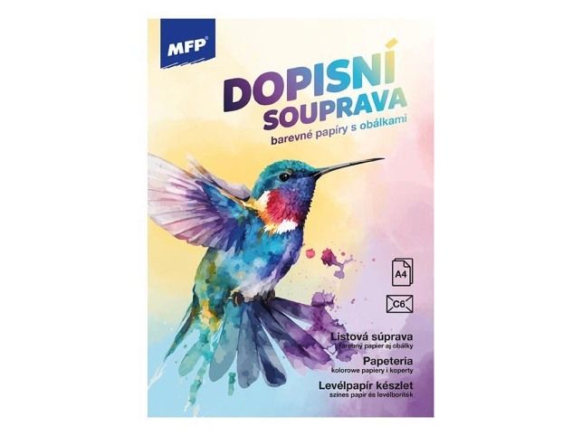 Dopisní souprava s obrázkem kolibříka. Píšete rádi dopisy svým známým? Pořiďte si u nás krásné dopisní papíry s různými motivy a nezapomeňte ani na psací potřeby. BALENÍ OBSAHUJE: - 10 potištěných dopisních papírů formátu A4 - 5 barevných poštovních obálek FORMÁT: A4 PROVEDENÍ: linkovaný Baleno v plastovém průhledném obalu se závěsem. Uvedená cena je za 1 balení.