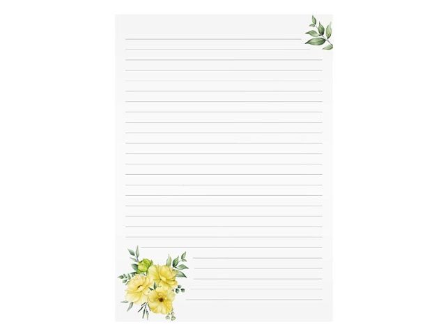 Když chcete potěšit! Tato svěží dopisní souprava se zářivými květy přináší energii a radost do každého řádku. Obsahuje linkované listy a ladící obálky, které se hodí pro osobní dopisy, přání i drobná poděkování. BALENÍ OBSAHUJE: - 10 potištěných dopisních papírů formátu A4 - 5 barevných poštovních obálek formátu C6 FORMÁT: A4 MOTIV: květy PROVEDENÍ: linkovaný Baleno v plastovém průhledném obalu se závěsem. Uvedená cena je za 1 balení.