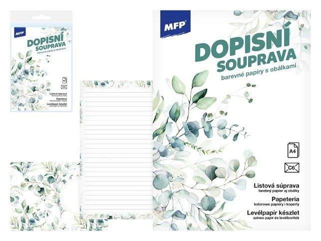 Dopisní souprava s obrázkem Květy. Píšete rádi dopisy svým známým? Pořiďte si u nás krásné dopisní papíry s různými motivy a nezapomeňte ani na psací potřeby. BALENÍ OBSAHUJE: - 10 potištěných dopisních papírů formátu A4 - 5 barevných poštovních obálek FORMÁT: A4 PROVEDENÍ: linkovaný Uvedená cena je za 1 balení. K dokonalosti je vše baleno v průhledném obalu se závěsem.
