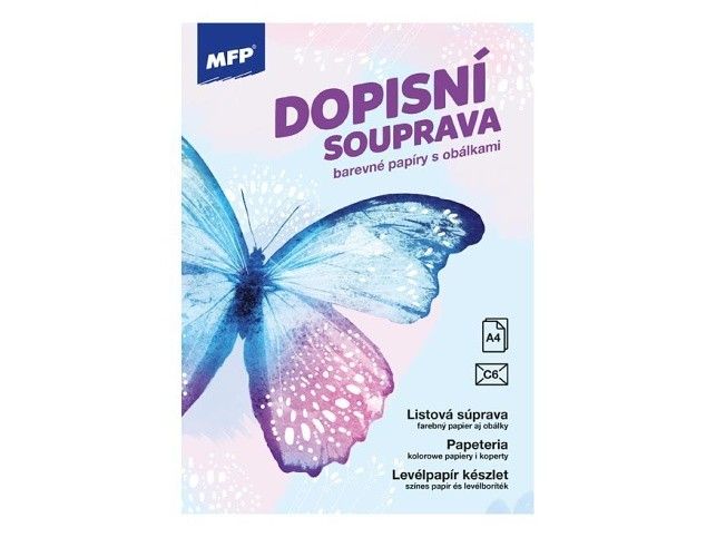 Dopisní souprava s obrázkem motýla. Píšete rádi dopisy svým známým? Pořiďte si u nás krásné dopisní papíry s různými motivy a nezapomeňte ani na psací potřeby. BALENÍ OBSAHUJE: - 10 potištěných dopisních papírů formátu A4 - 5 barevných poštovních obálek FORMÁT: A4 PROVEDENÍ: linkovaný Baleno v plastovém průhledném obalu se závěsem. Uvedená cena je za 1 balení.