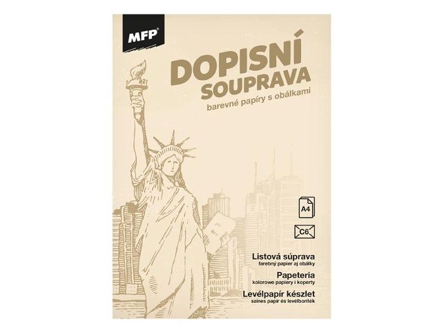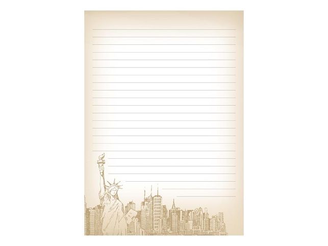 Dopisní souprava s obrázkem New Yorku a Sochy Svobody - Píšete rádi dopisy svým známým? Pořiďte si u nás krásné dopisní papíry s různými motivy a nezapomeňte ani na psací potřeby. BALENÍ OBSAHUJE: - 10 potištěných dopisních papírů formátu A4 - 5 barevných poštovních obálek FORMÁT: A4 PROVEDENÍ: linkovaný Uvedená cena je za 1 balení. K dokonalosti je vše baleno v průhledném obalu se závěsem.