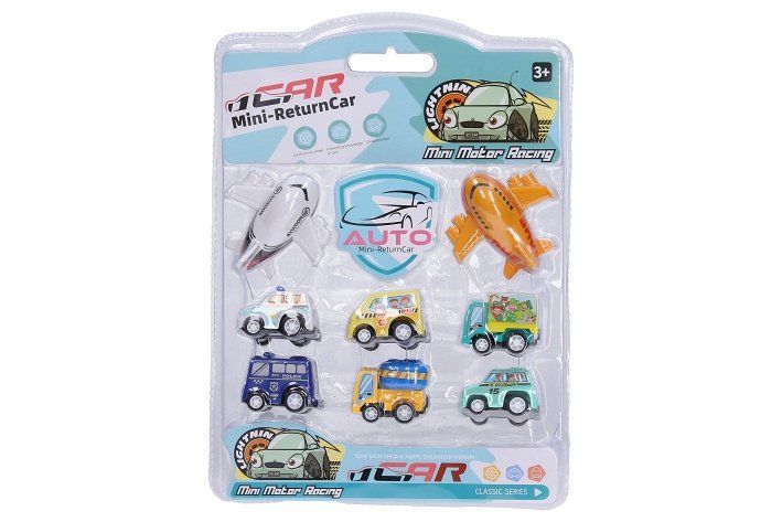 Dopravní prostředky 8 ks. Velikost 7 cm. Na zpětné natažení. Obsah balení - 6 autíček a 2 letadla.