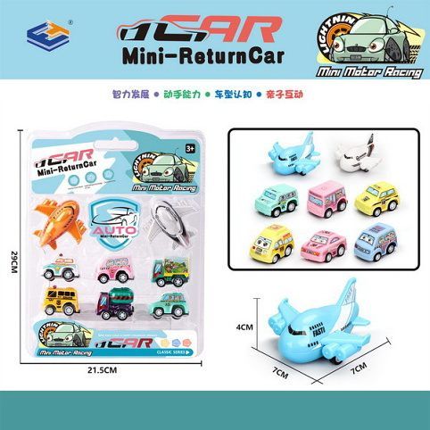 Dopravní prostředky 8 ks. Velikost 7 cm. Na zpětné natažení. Obsah balení - 6 autíček a 2 letadla.