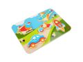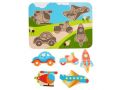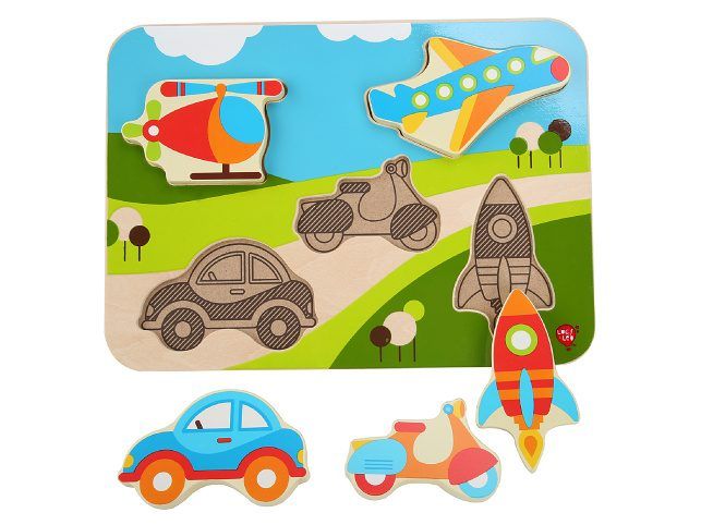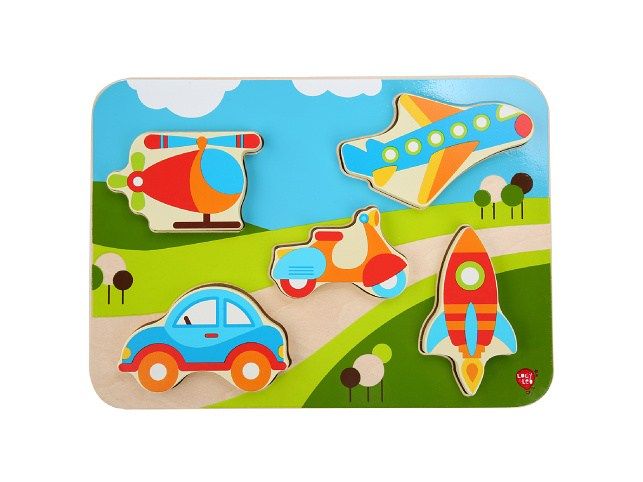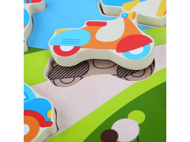Dřevěné vkládací puzzle bez úchytek s motivem aut a dalších dopravních prostředků potěší nejen malé kluky. Díly jsou velké, krásně ilustrované a každý je trochu jiný. Na této vkládačce si děti procvičí jemnou motoriku, prostorovou orientaci a v neposlední řadě trpělivost. Na hladké barevné desce jsou nakresleny různé dopravní prostředky. Pět vystouplých dřevěných tvarů dopravních prostředků lze jednoduše uchopit a vložit do správných vyfrézovaných drážek na barevnou desku. Složený obrázek si společně popište, pojmenujte barvy a tvary, spočítejte konkrétní zobrazené věci. Výška desky 21 cm, délka 29 cm, délka dopravního prostředku cca 10,5 cm, tloušťka cca 1 cm.