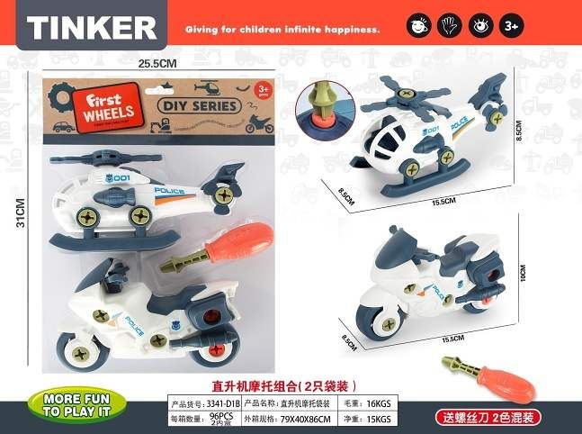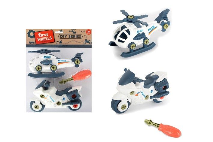 Dopravní prostředky šroubovací. Velikost 15,5 cm. Obsah balení - helikoptéra, motorka, šroubovák.