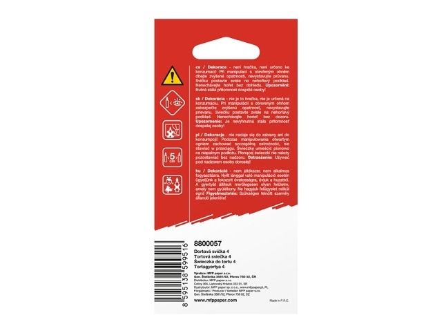 Dortová svíčka ve tvaru číslice 4, rozměr svíčky je 7,4 x 4,4 x 1,3 cm. Duhový potisk z jedné strany.