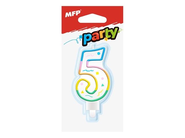 Dortová svíčka ve tvaru číslice 5, rozměr svíčky je 7,4 x 4,4 x 1,3 cm. Duhový potisk z jedné strany.