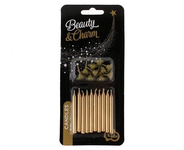 Dortové svíčky zlaté. V balení 10 svíček + 10 x podstavec.