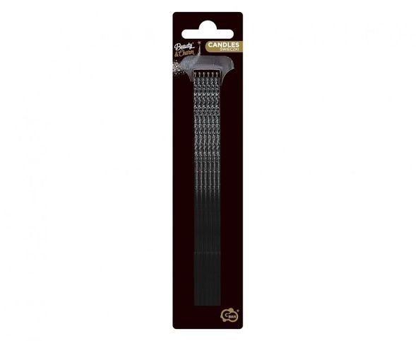 Dortové svíčky, černé s bárevným brokátem o délce 17 cm. V balení 6 ks.