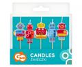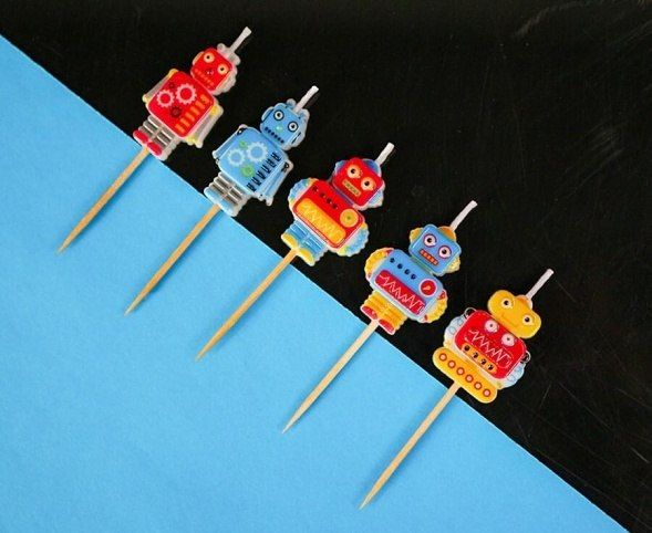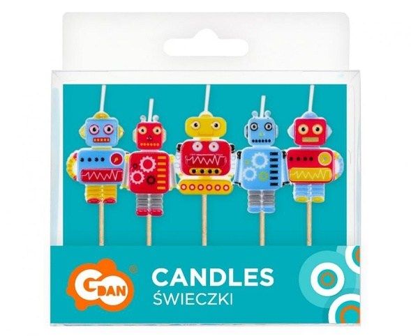 Dortové svíčky s motivy robotů.